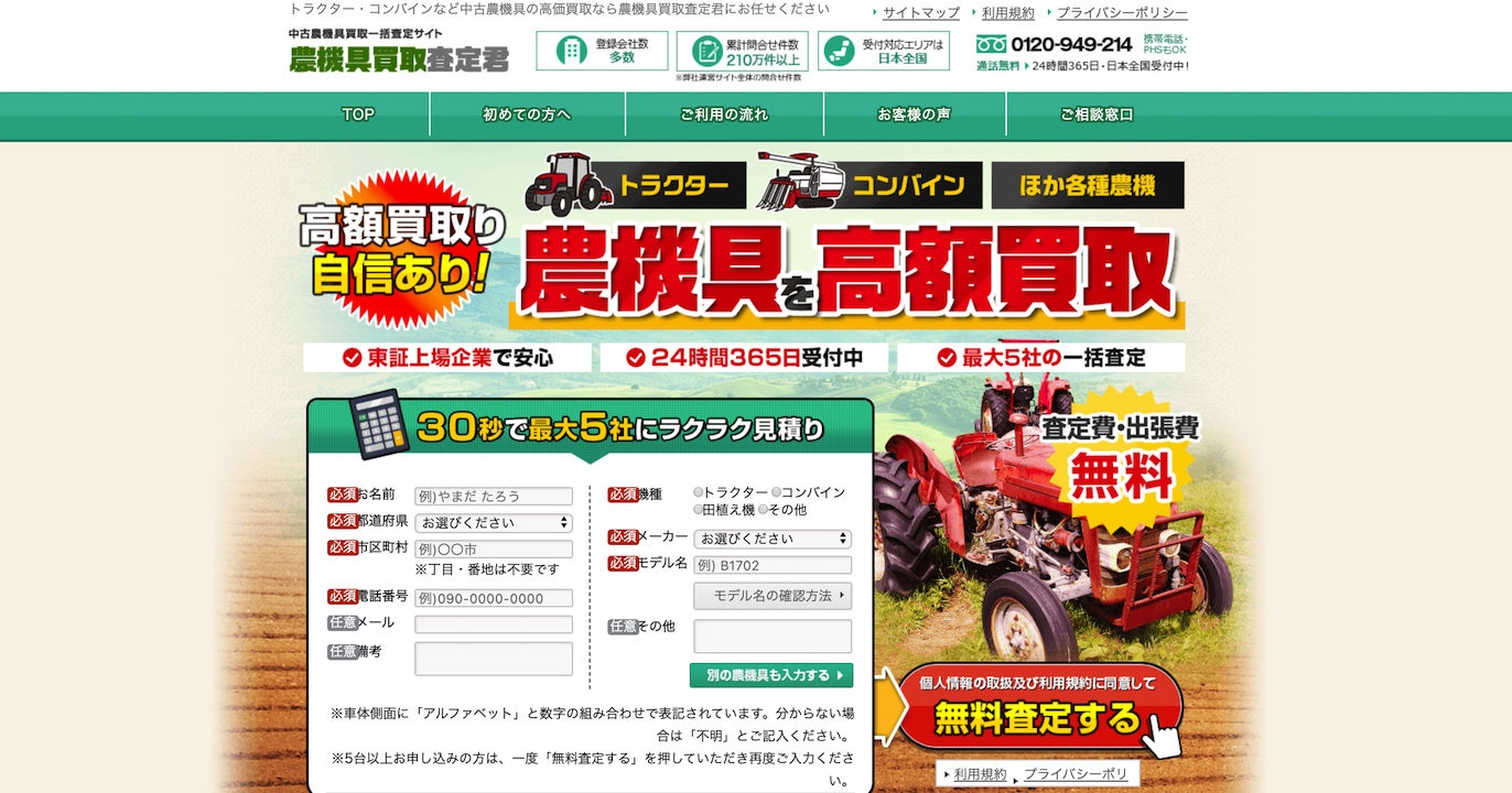 インターネットでの買取査定は、上記で紹介した、「農機具買取査定君」や「ノウキナビ」、「農機具高く売れるドットコム」など、ウェブ上で査定をしてくれる業者です。インターネット上なので、個人情報と、商品の名前、型番、品質を入力するだけで見積もり査定をしてくれる便利な査定サイトです。また買取金額も、コストをかけない体制を構築しているため、高く買い取ってくれる可能性が高いといえます。また電話などが好きではない方はLINEなどでも対応してくれるため、時間がない方にも安心して利用ができます。